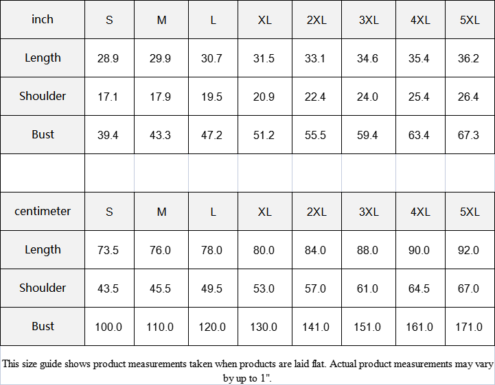 | Centimeter | S | M | L | XL | 2XL | 3XL | 4XL | 5XL |
