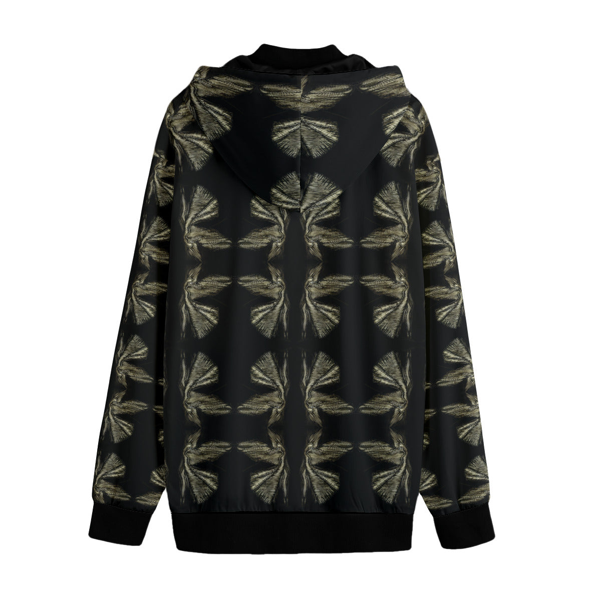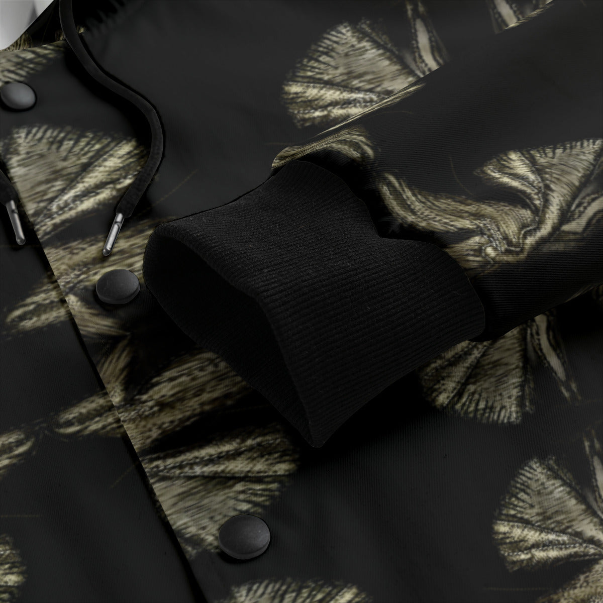 - Button closure, black rib cuffs and hem.
