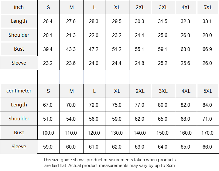 | Centimeter | S | M | L | XL | 2XL | 3XL | 4XL | 5XL |