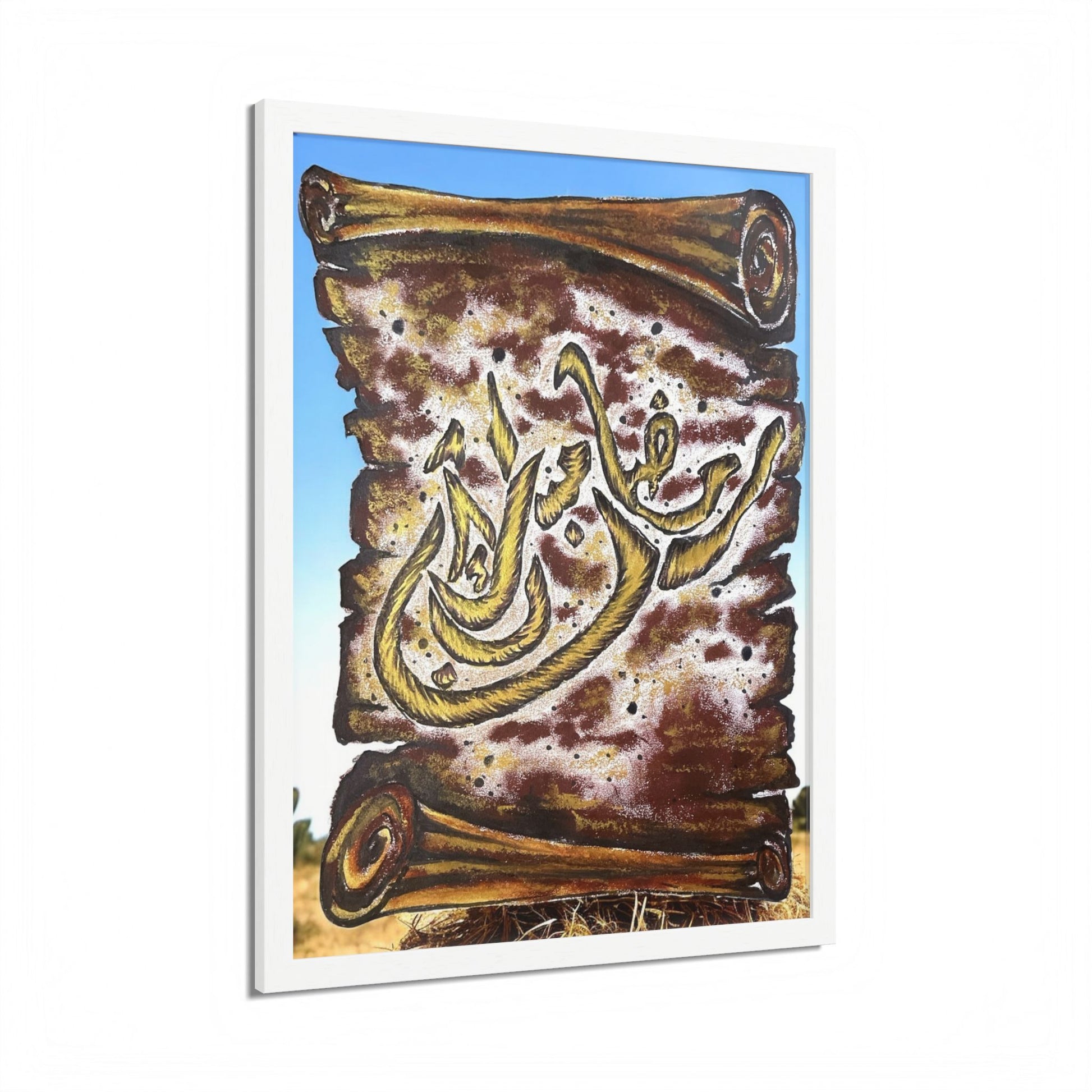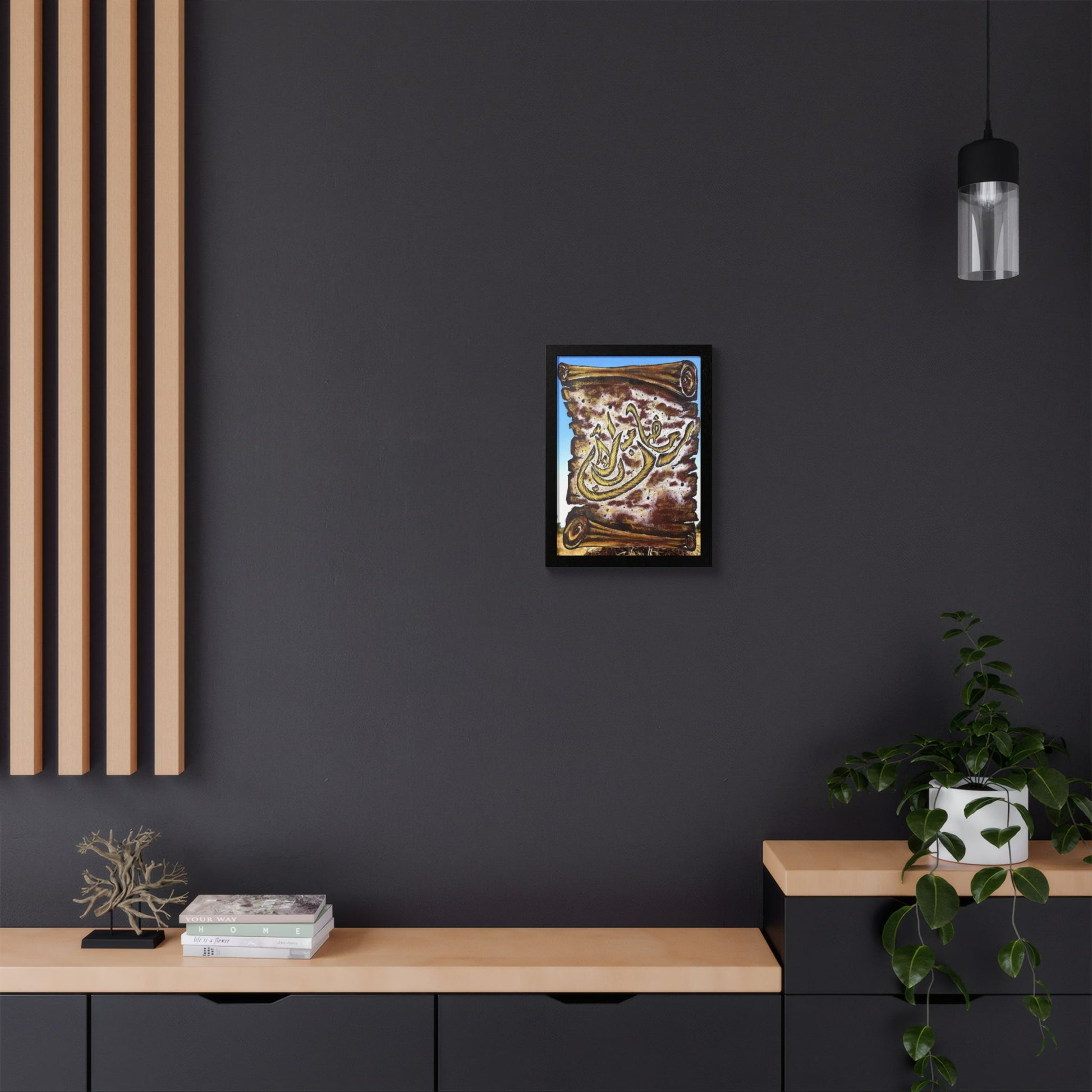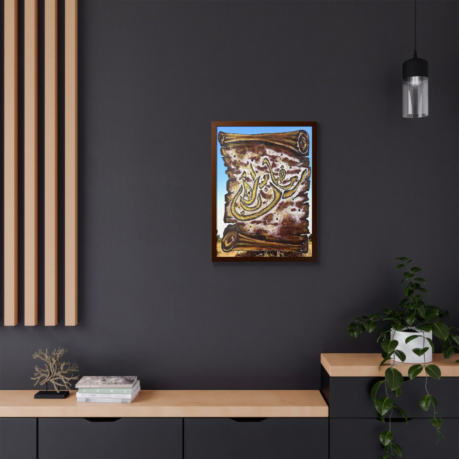 This framed poster blends bold, expressive brushwork with a warm, earthy palette to create a piece that feels both ancient and immediate. The textured background and fluid calligraphic strokes invite close viewing — the kind of art that anchors a room and sparks quiet conversation. Hand-crafted wooden framing and a clear Perspex cover give the print a polished, museum-like presence while keeping it approachable and durable. It arrives ready to hang so you can place it on a living room wall, entryway, or personal study to set a reflective, soulful tone.
