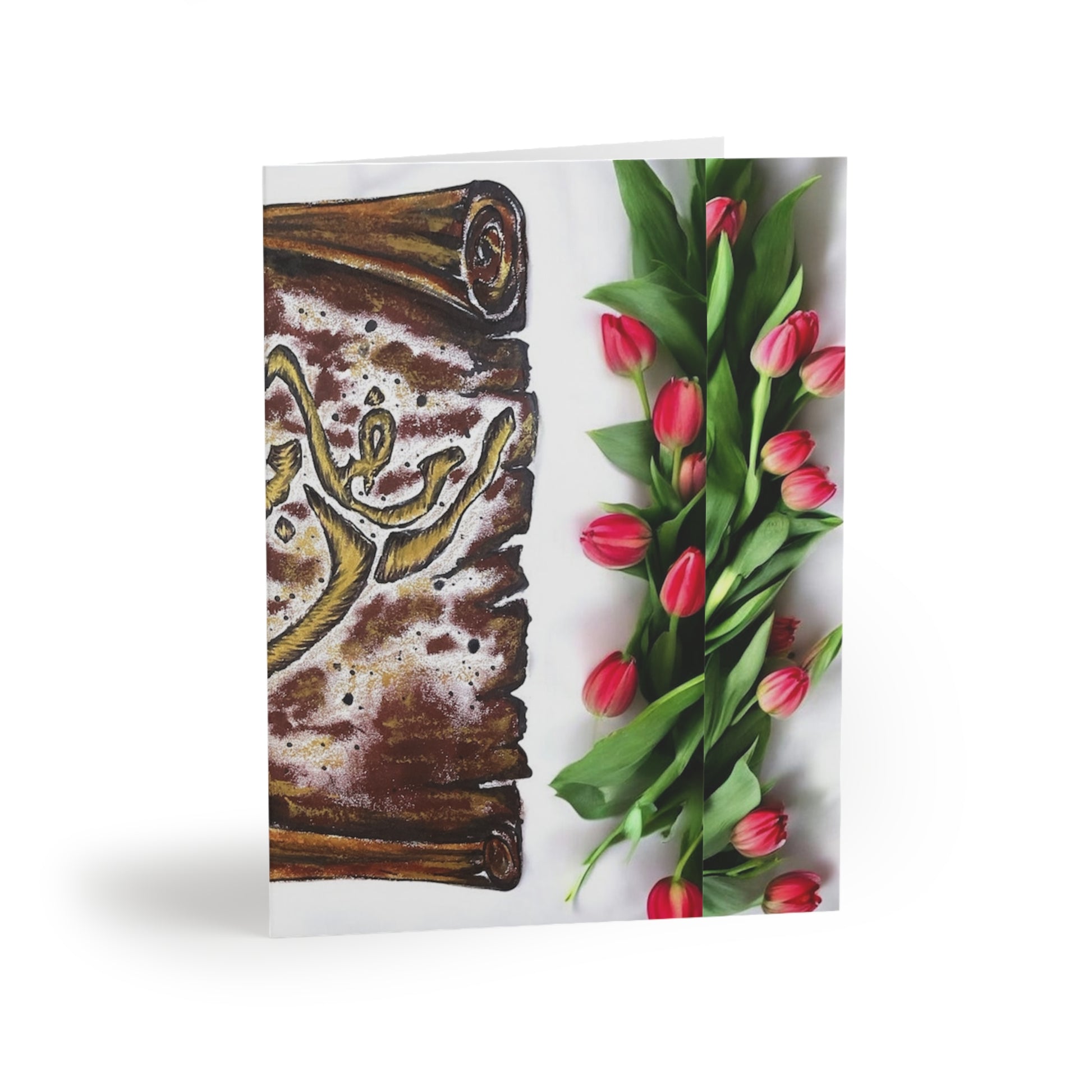 Floral Tulip & Scroll Arabic Calligraphy Greeting Cards — Pack of 8/16/24
