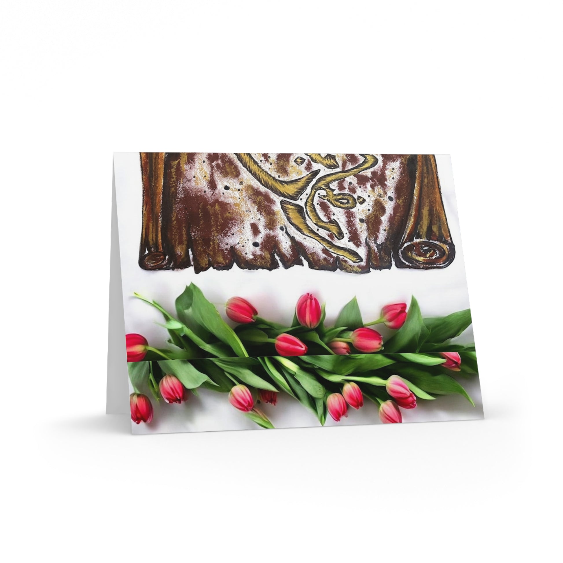 These folded greeting cards capture a moment — soft matte paper, bright color, and a handcrafted feel that reads like a little pause in someone’s day. A column of pink tulips leans beside a warm, textured scroll design, creating a quiet blend of floral freshness and tactile, vintage charm. Slip one into a matching white envelope and send a note that feels personal: a short thank-you, a thinking-of-you line, or a simple celebration. They sit comfortably on a hall table or tucked into a bouquet, adding color and calm to birthday mornings, house visits, or seasonal greetings.