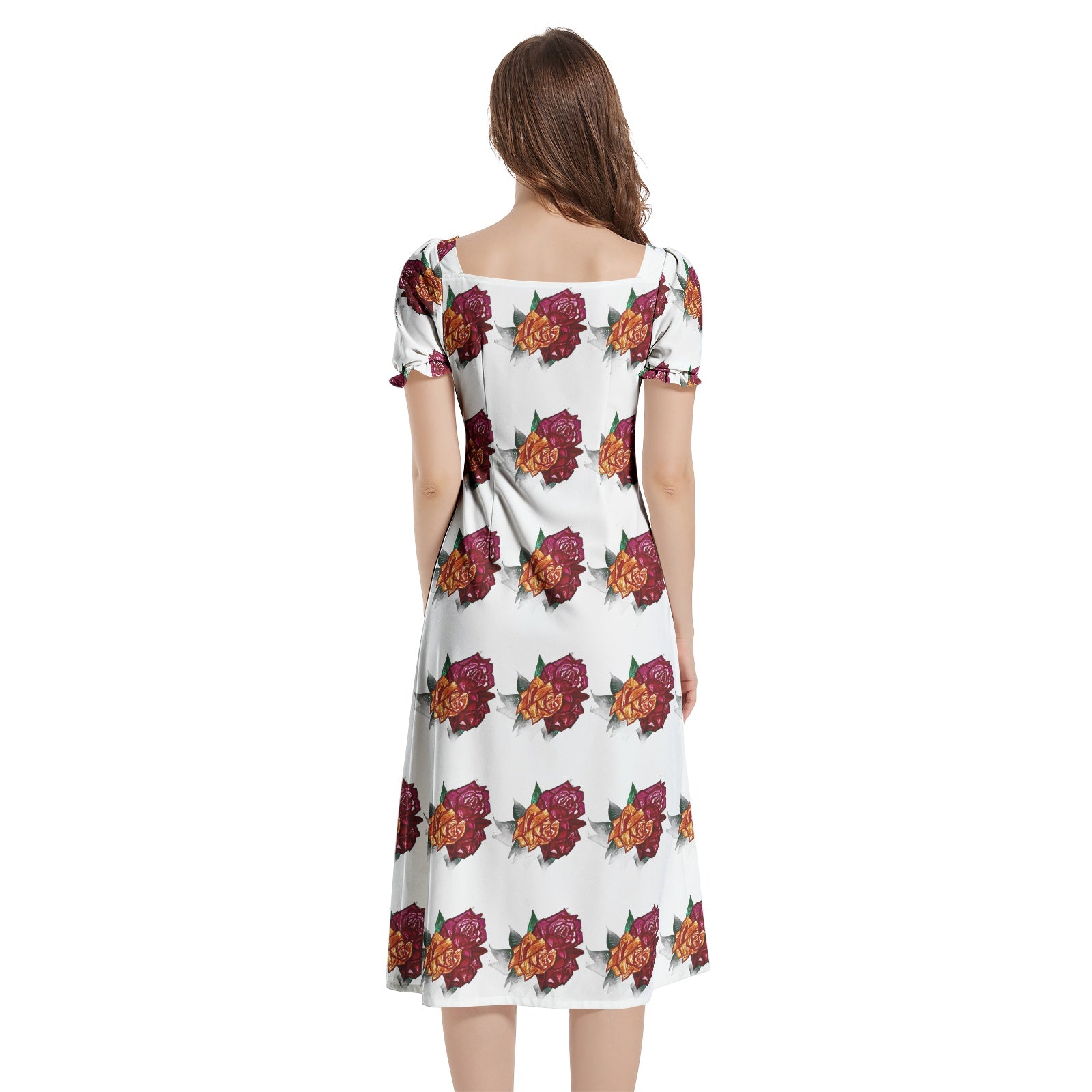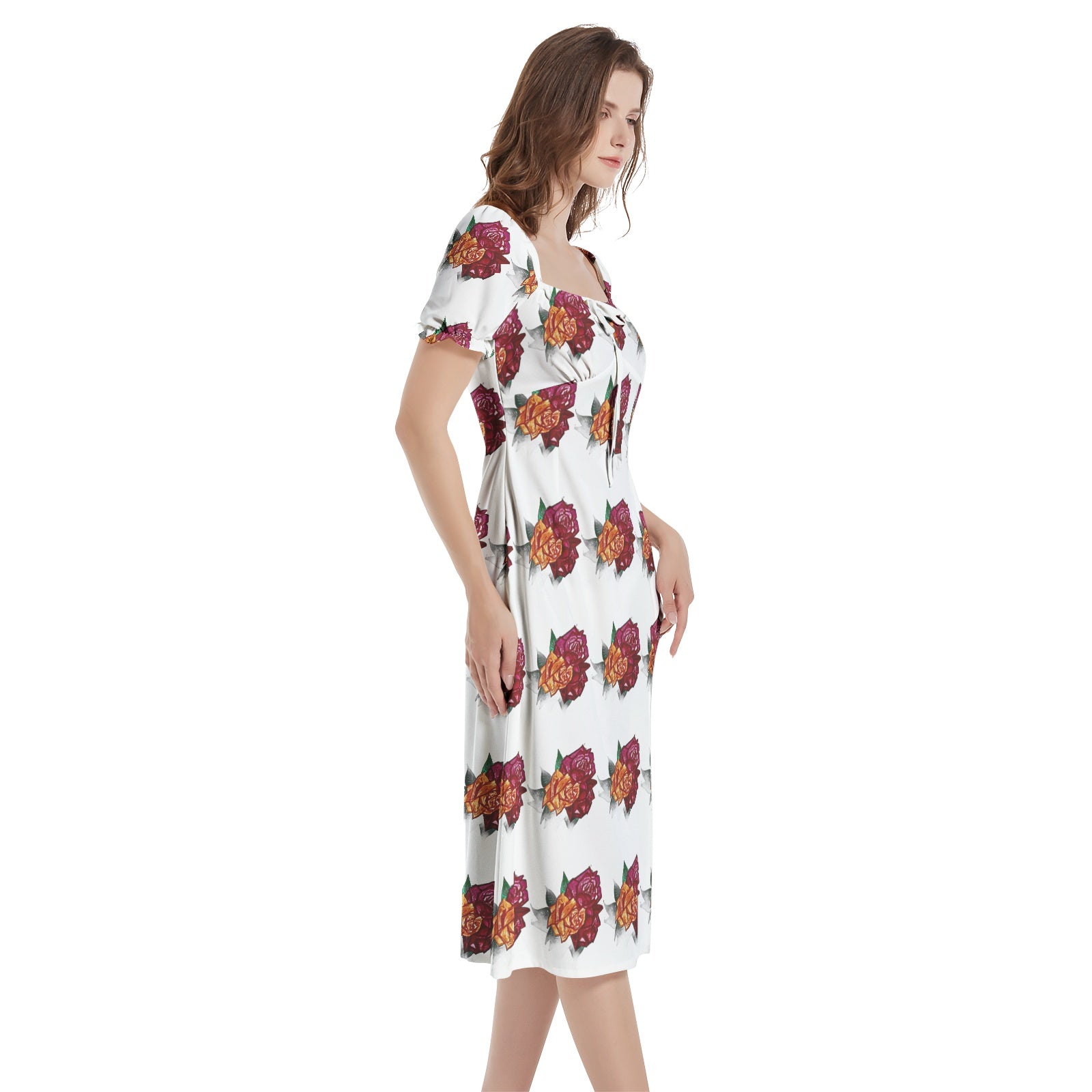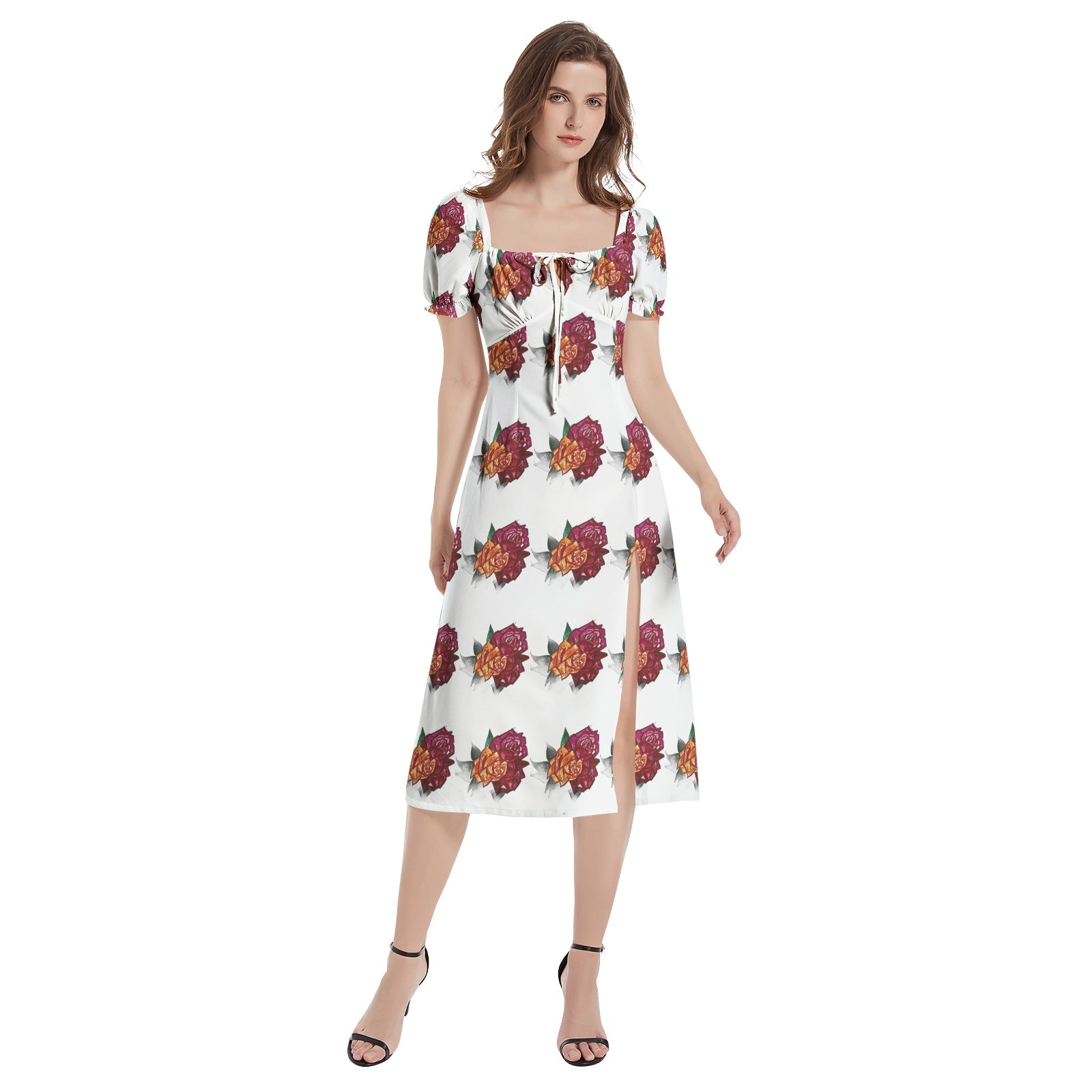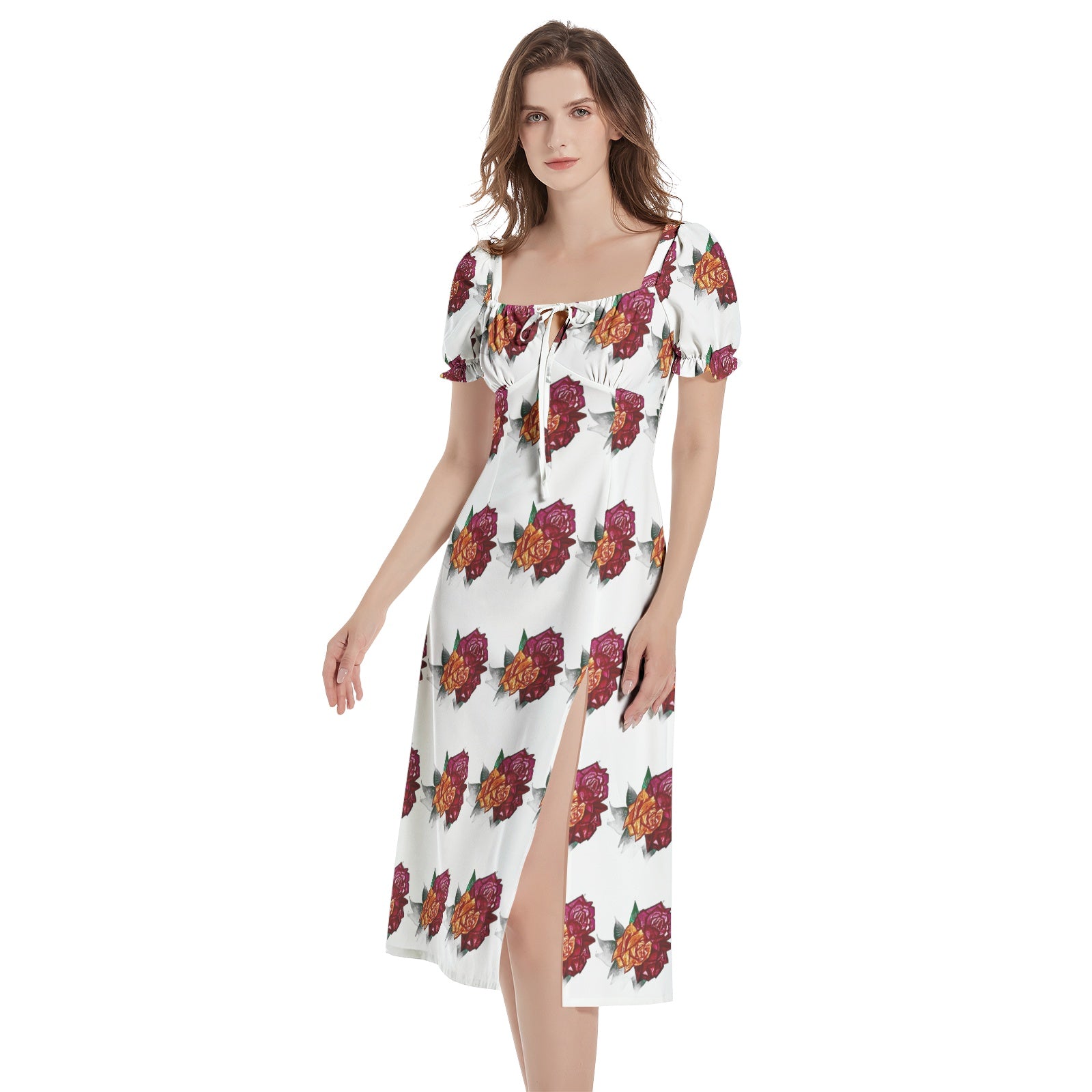 Short puff sleeve, Drawstrings, High waist, Split thigh,Side hideen zipper, Women's elegant midi dress