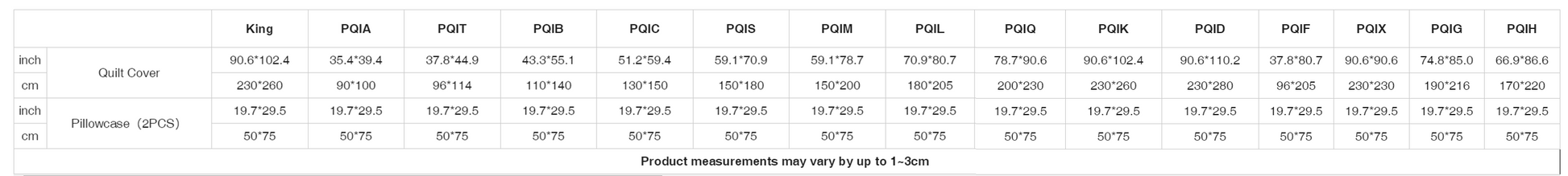 | inch | Quilt Cover | 90.6*102.4 | 35.4*39.4 | 37.8*44.9 | 43.3*55.1 | 51.2*59.4 | 59.1*70.9 | 59.1*78.7 | 70.9*80.7 | 78.7*90.6 | 90.6*102.4 | 90.6*110.2 | 37.8*80.7 | 90.6*90.6 | 74.8*85.0 | 66.9*86.6 |