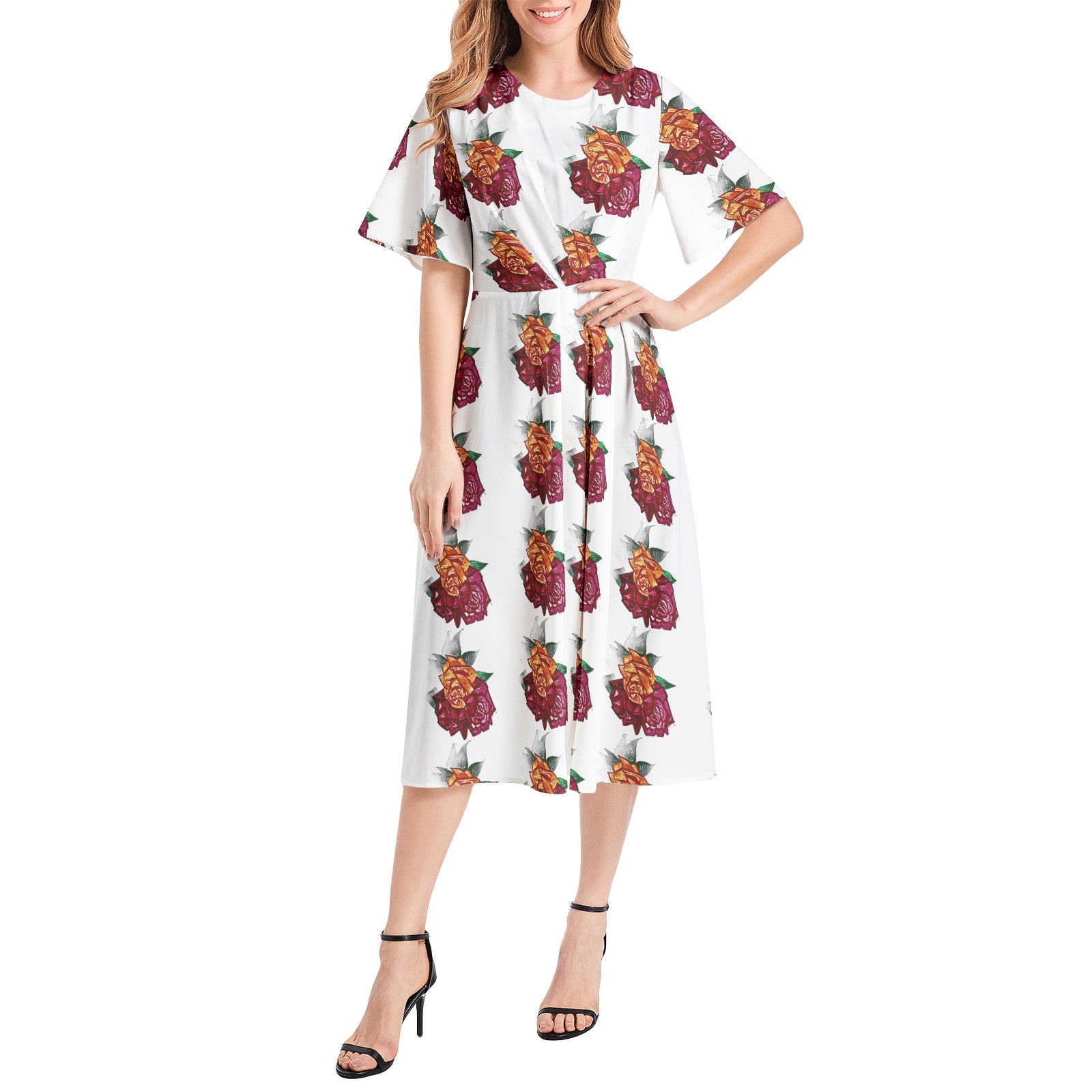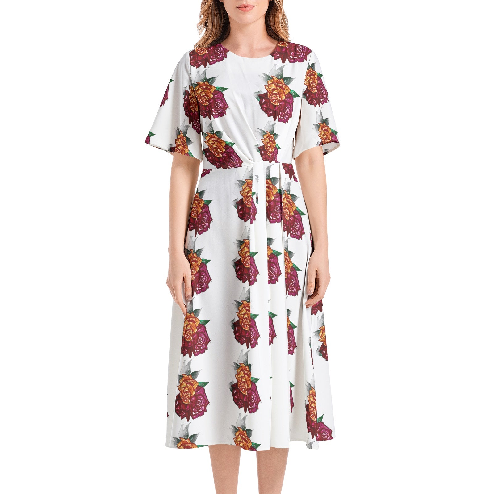 Short Sleeve Waist Folding Midi Dress