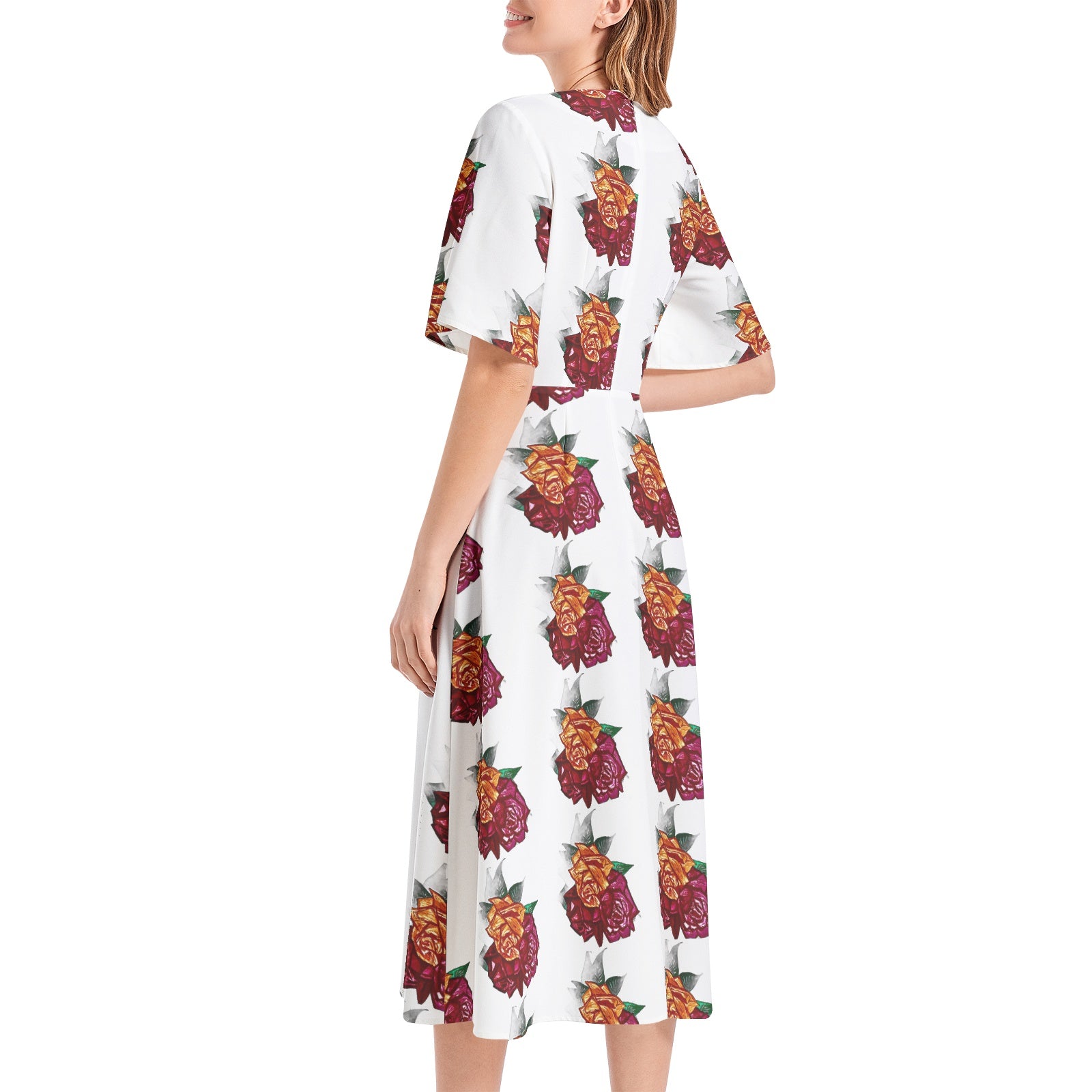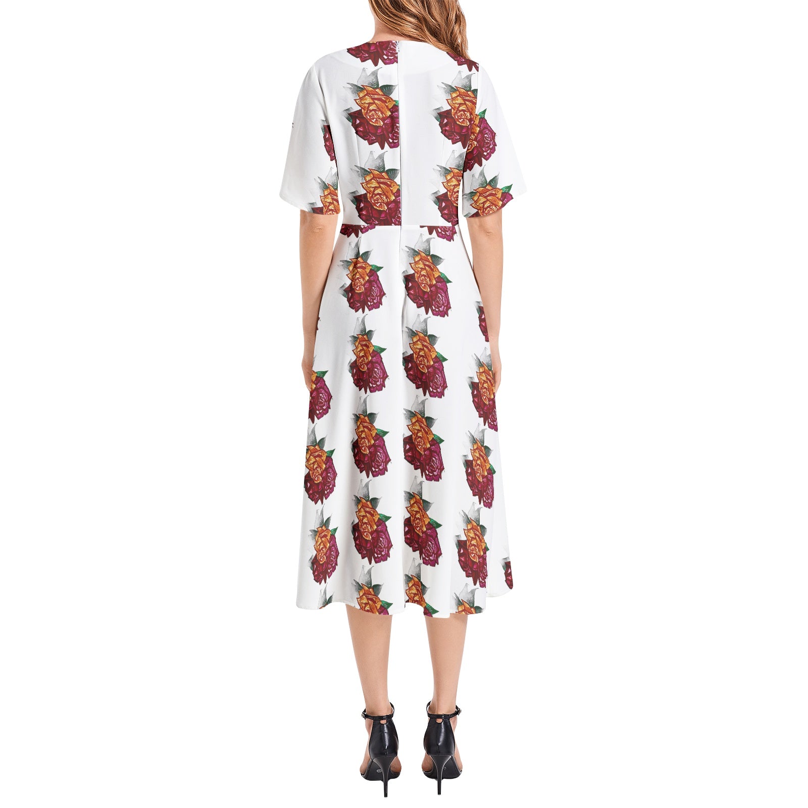Short Sleeve, Boat Neck, Back hidden zipper, High waist, Flared hem, Midi dress