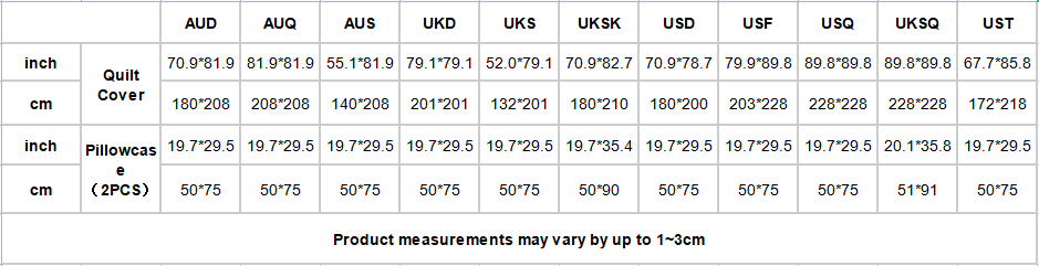 | inch | Quilt Cover | 70.9*81.9 | 81.9*81.9 | 55.1*81.9 | 79.1*79.1 | 52.0*79.1 | 70.9*82.7 | 70.9*78.7 | 79.9*89.8 | 89.8*89.8 | 89.8*89.8 | 67.7*85.8 |