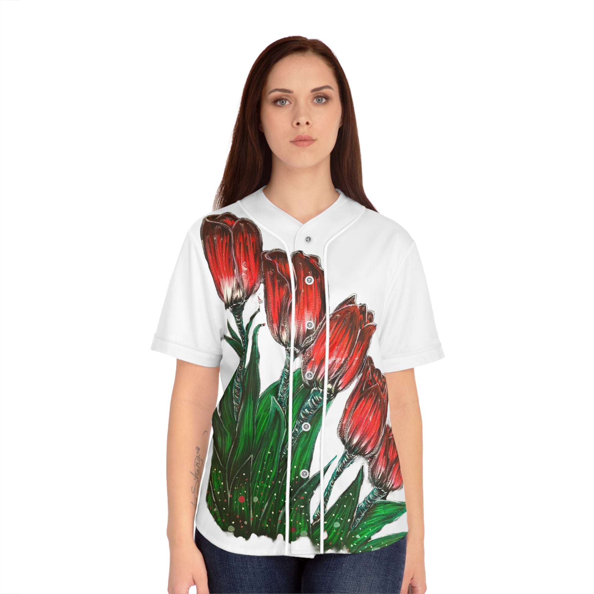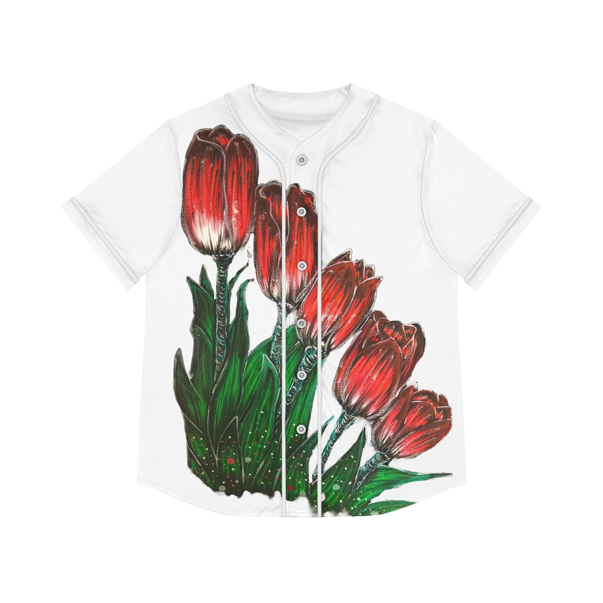 All-over prints make the crowd go wild - add yours now to this women's AOP baseball jersey & create an instant favorite. Featuring a full-button front and a rounded hem, these tees feature moisture-wicking fabric that keeps you cool when it's time to perform. Choose between a white or black trim color and buttons, add your design, and make it uniquely yours.